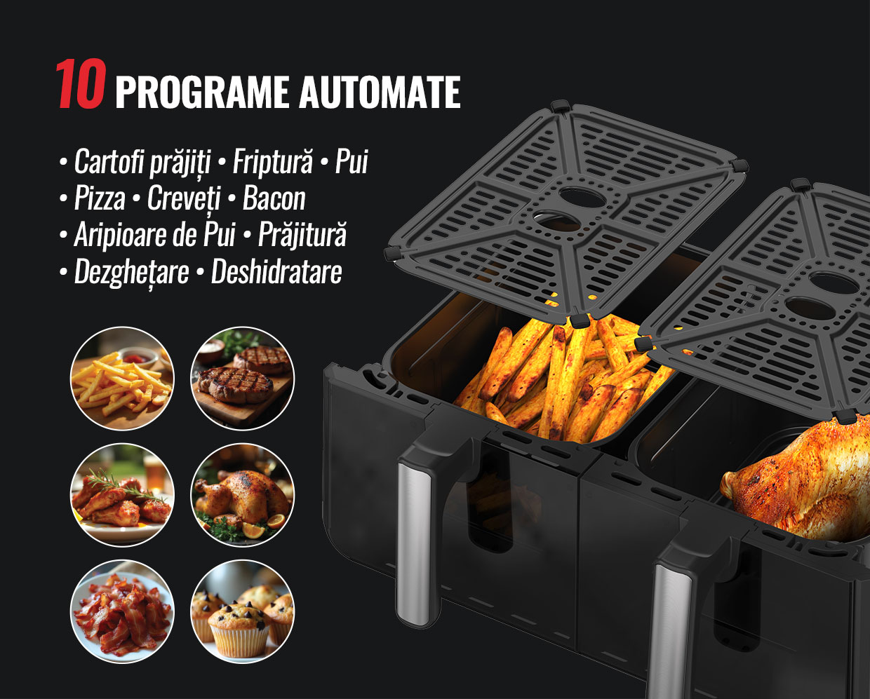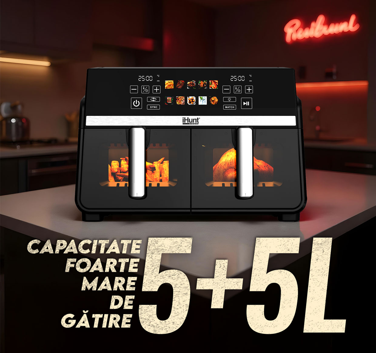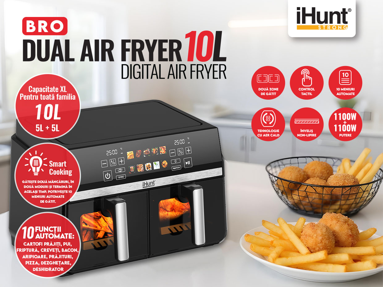 iHunt Bro Dual Air Fryer 10L iti aduce flexibilitate si putere: doua camere independente de 5L + 5L (total 10L) care permit sa gatesti doua preparate diferite, in acelasi timp, fara compromisuri. Ideala pentru familii, petreceri sau cine cand vrei mai multe optiuni rapid. ⚡🍽️