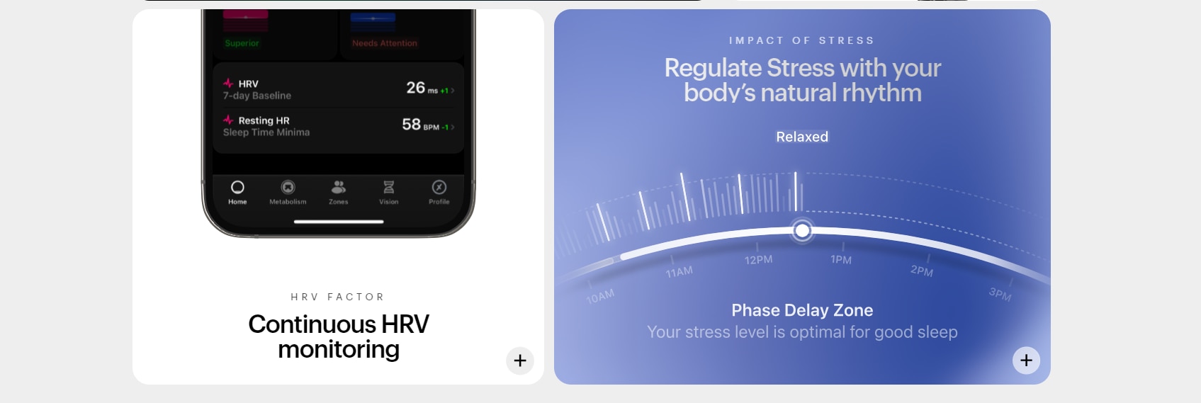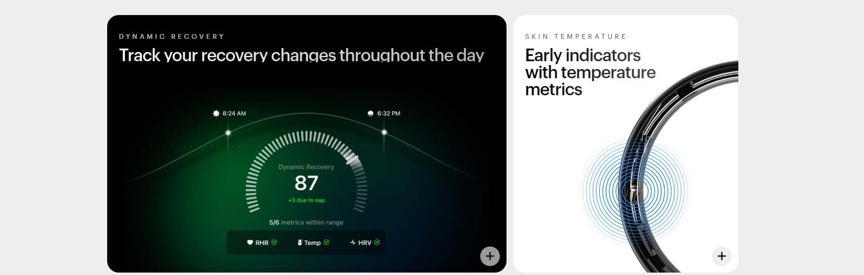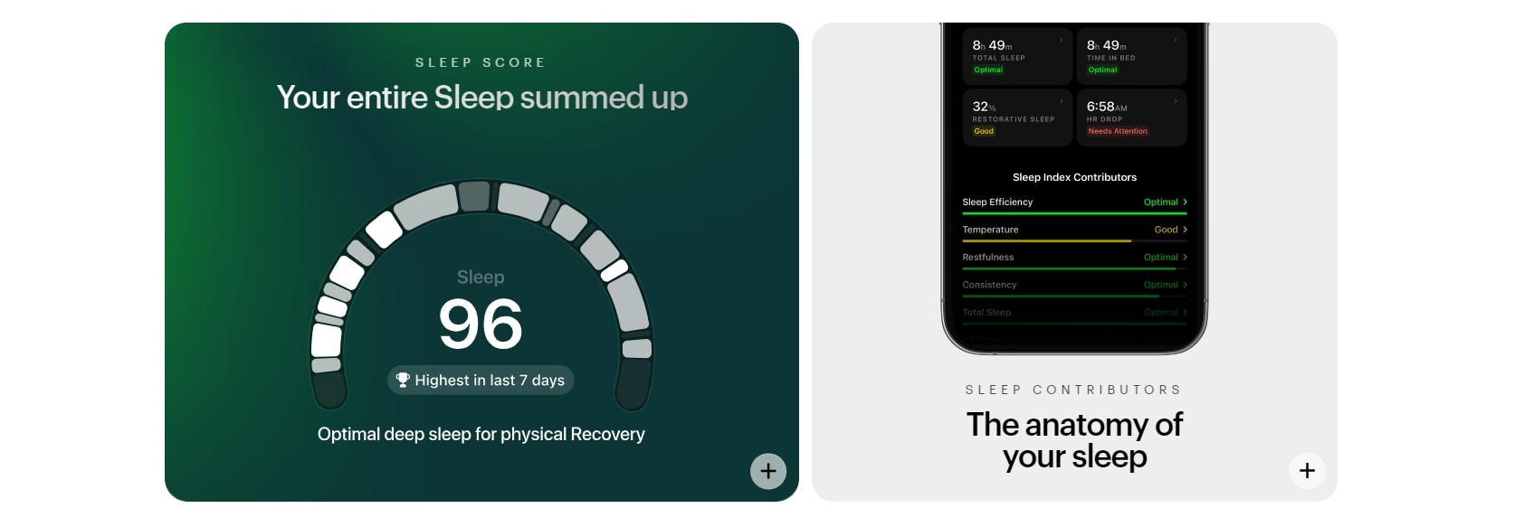 | Scorul de recuperare dinamica Un singur scor reflecta recuperarea zilnica a corpului tau. Se bazeaza pe biomarkeri precum HRV, RHR, ritmul stresului si temperatura pielii, care indica starea ta de recuperare. | ![]() |