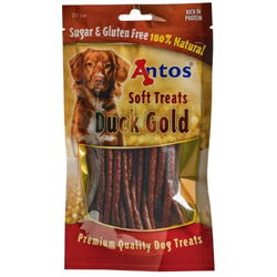 Beneficii: Recompensele Antos Duck Gold sunt delicioase și fabricate cu carne de rață veritabilă, pentru a ajuta la menținerea masei musculare. Sunt completarea perfectă a formulelor nutriționale de hrană pentru câini, sub formă de crochete sau hrană umedă. Aceste gustări premium apetisante sunt 100% naturale, perfecte drept gustare între mese sau un simplu moment de răsfăț. Nu conțin zahăr, cereale sau gluten și sunt bogate în proteine. Având o densitate mică, sunt potrivite pentru a fi consumate zilnic de către câinii care nu pot mesteca hrana cu putere, precum cei seniori.